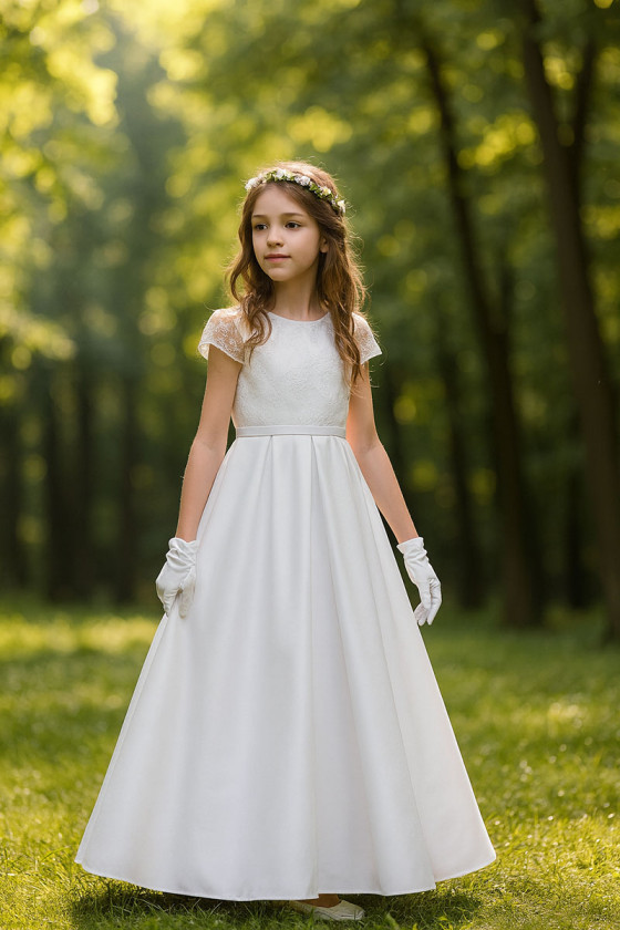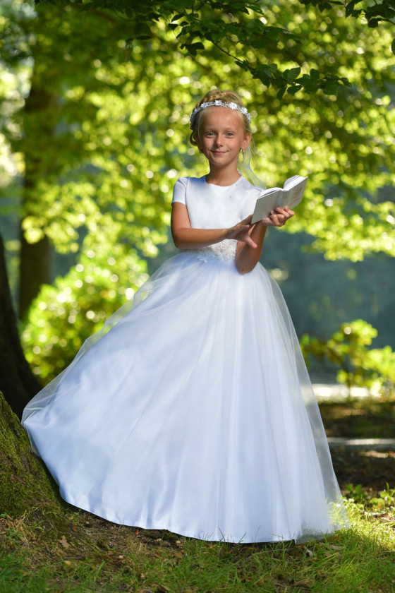 Prostota i elegancja to słowa cechujące model sukienki komunijnej "Luisa". Uszyta z wysokiej jakości materiałów. Góra z satyny a dół z satyny pokrytej mięciutkim tiulem. Delikatnie zdobi ją perłowa ozdoba w pasie a na górze sukienki naszyta została hostia.