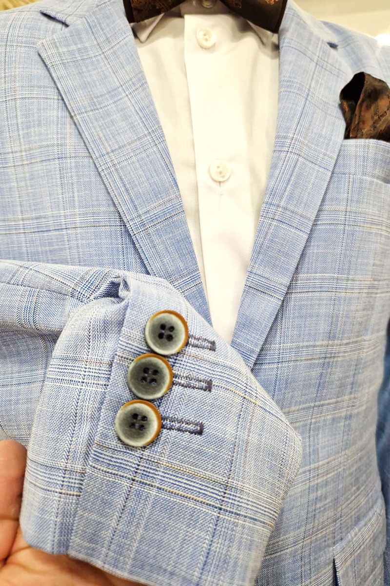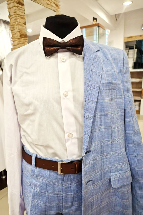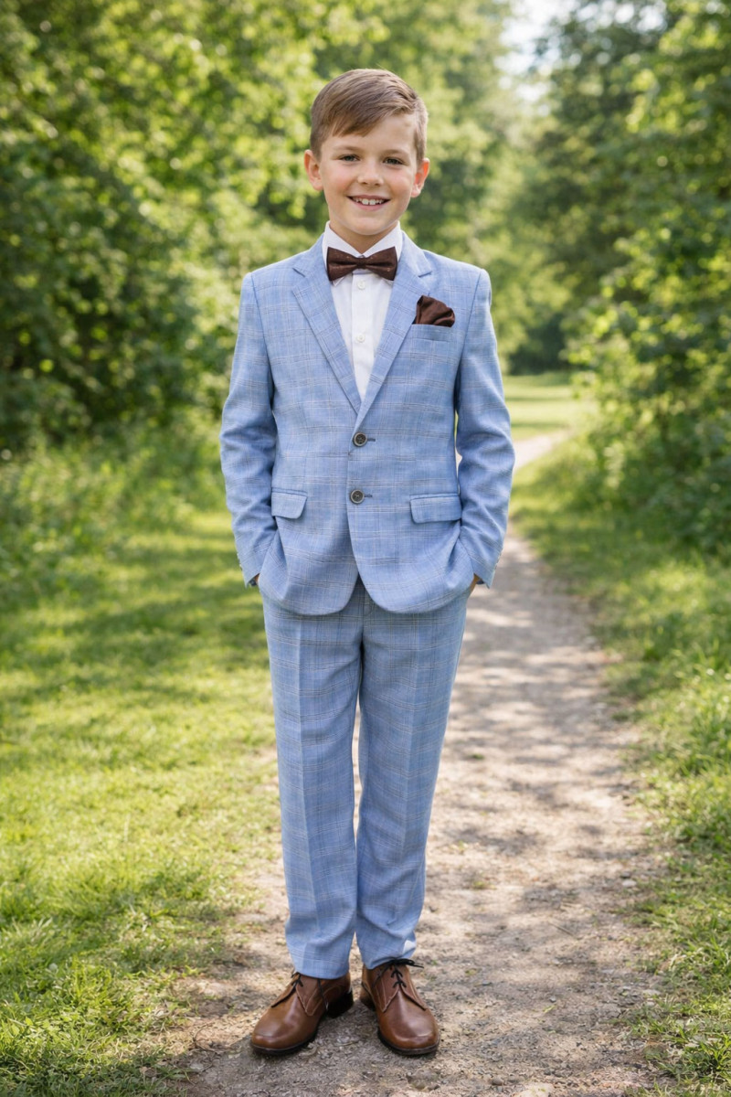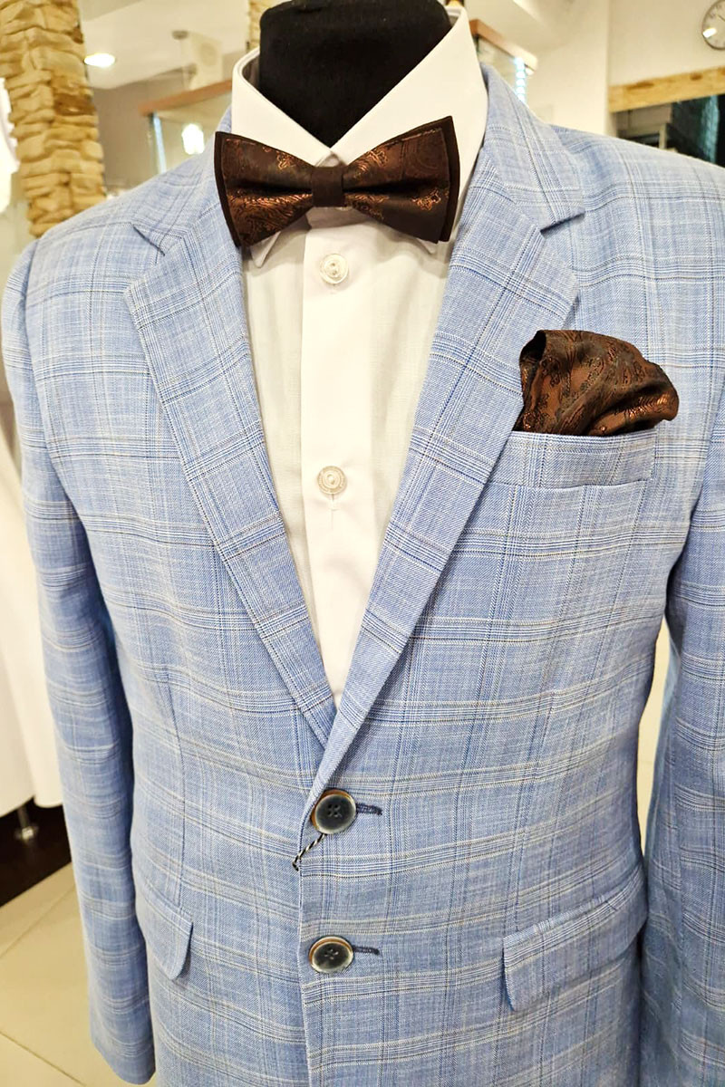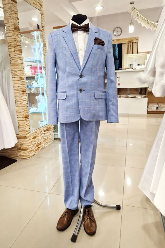 Garnitur wizytowy dla eleganckiego chłopca. Będzie idealny na pierwszą Komunię Świętą . W modnym kolorze jasnego niebieskiego z delikatną kratką.